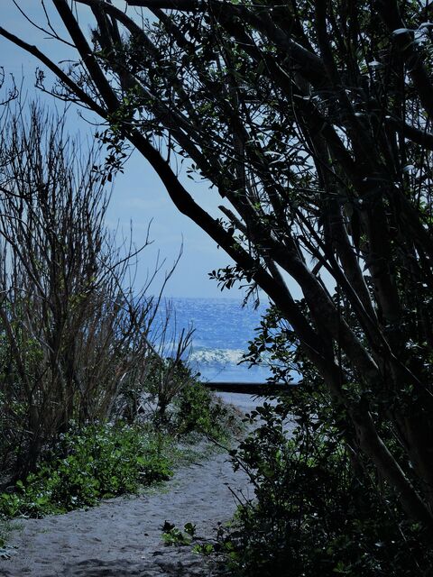 細い道の向こうには、青い青い海が輝いています。